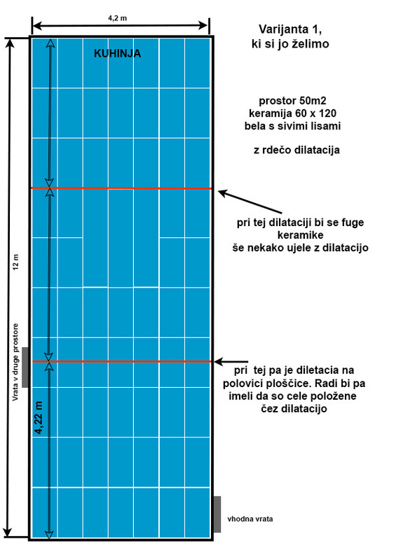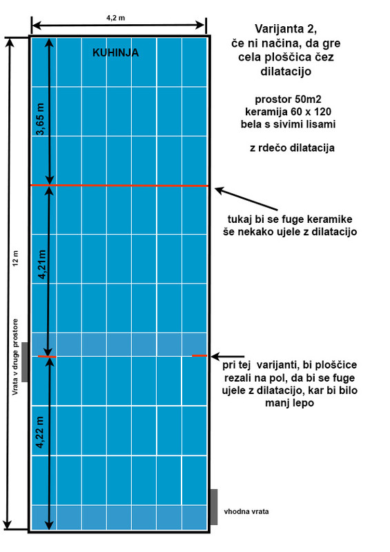Bolj ko berem in iščem rešitev, bolj sem zmeden. Estrih je narejen. Prostor je velik 50 m2. Mere dolžina 12 m, širina 4,2 m. Prostor bo enoten, kuhinja in dnevna. Dolžino bom edino zmanjšal za hodnik širok 1,8m. Naredili so mi dve dilataciji čez širino 4,2 m. Polagal bom keramiko 60x120, po dolžini eno poleg druge, brez zamikov. Na eni dilataciji bi se še nekako ujemala fuga keramike z dilatacijo. Na drugi pa bi rad položil čez, saj mi dilatacija pride prav na sredini ploščice (60 cm).